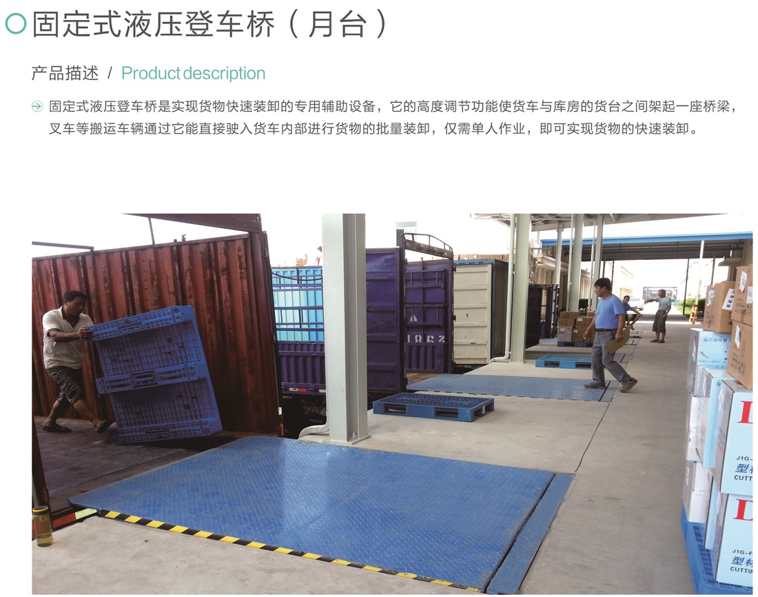 固定式液壓登車橋是實現(xiàn)貨物快速裝卸的專用輔助設(shè)備,它的高度調(diào)節(jié)功能使貨車與庫房的貨臺之間架起一座橋梁,叉車等搬運車輛通過它能直接駛?cè)胴涇噧?nèi)部進行貨物的批量裝卸,僅需單人作業(yè),即可實現(xiàn)貨物的快速裝卸。