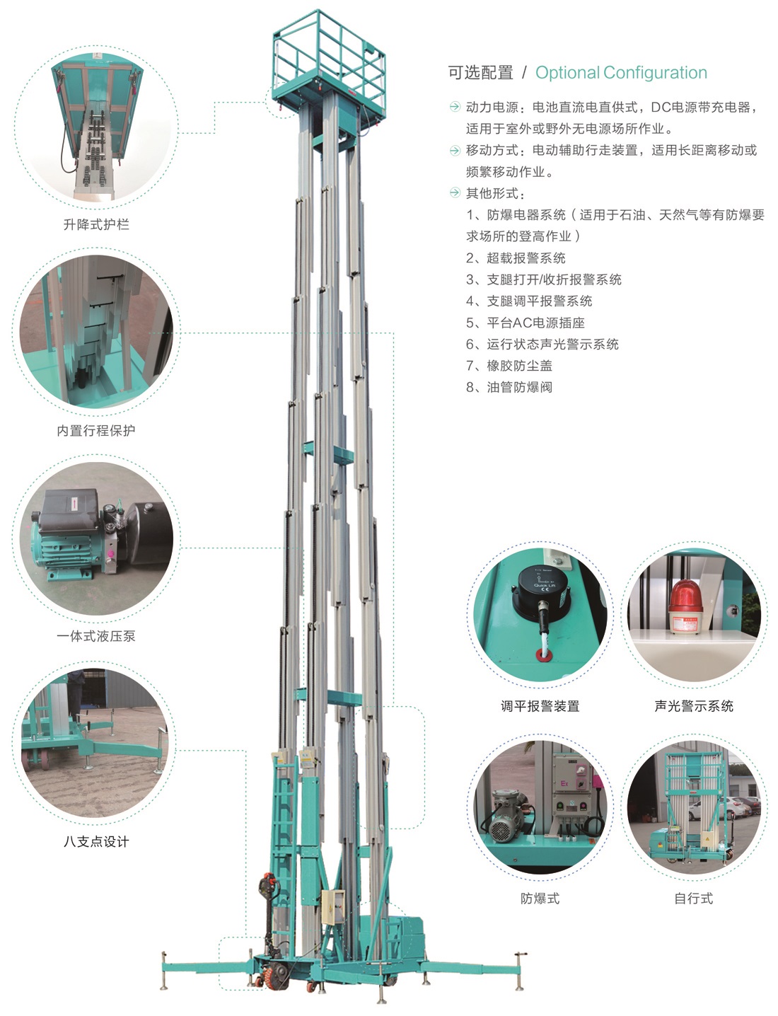 平臺最大高度規(guī)格:可選 10m、12m、14m、15m、16m特點:可雙人同時登高作業(yè),升降更平穩(wěn),且能達到更高作業(yè)高度,可代替?zhèn)鹘y(tǒng)腳手架,提高工作效率,保障操作人員安全,是高空作業(yè)的必備工具。