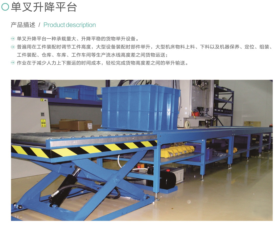單叉升降平臺一種承載量大、升降平穩(wěn)的貨物舉升設(shè)備。普遍用在工件裝配時調(diào)節(jié)工件高度,大型設(shè)備裝配時部件舉升,大型機床物料上料、下料以及機器保養(yǎng)、定位、組裝、工件裝配、倉庫、車庫、工作車間等生產(chǎn)流水線高度差之間貨物運送;作業(yè)在于減少人力上下搬運的時間成本,輕松完成貨物高度差之間的舉升輸送。